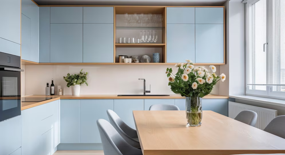 Сочетание светлого дерева и белых фасадов в дизайне кухни. Фото: freepik.com