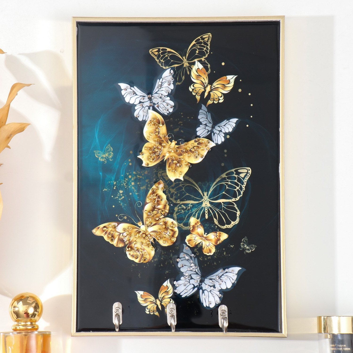 Ключница пластик, МДФ 3 крючка "Волшебные бабочки" стразы, золото 29х1,8х19 см 9398115