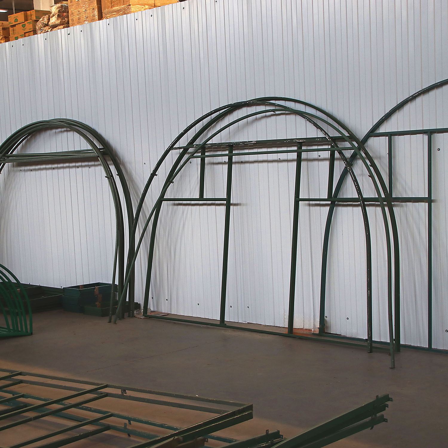Каркасы легко трансформируются, что позволяет изменить размеры полезной площади. Конструкцию можно применять при строительстве сборно-разборных сезонных теплиц и в качестве капитального сооружения. В каркасе предусмотрены двери и форточки, расположенные с обеих торцевых сторон.