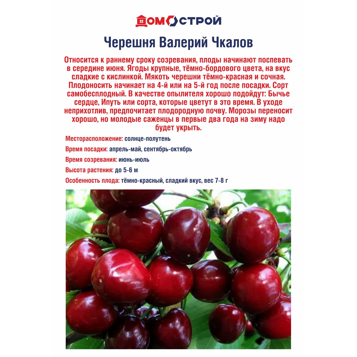 Относится к раннему сроку созревания, плоды начинают поспевать в середине июня. Ягоды крупные, темно-бордового цвета, на вкус сладкие с кислинкой. Мякоть черешни темно-красная и сочная. Плодоносить начинает на 4-й или на 5-й год после посадки. Сорт самобесплодный.