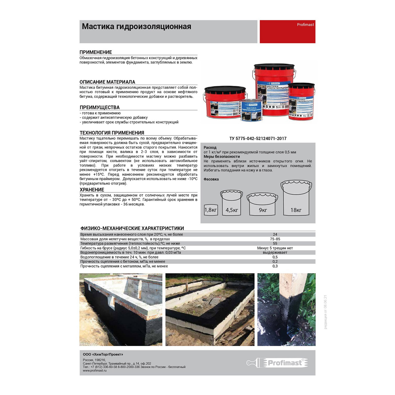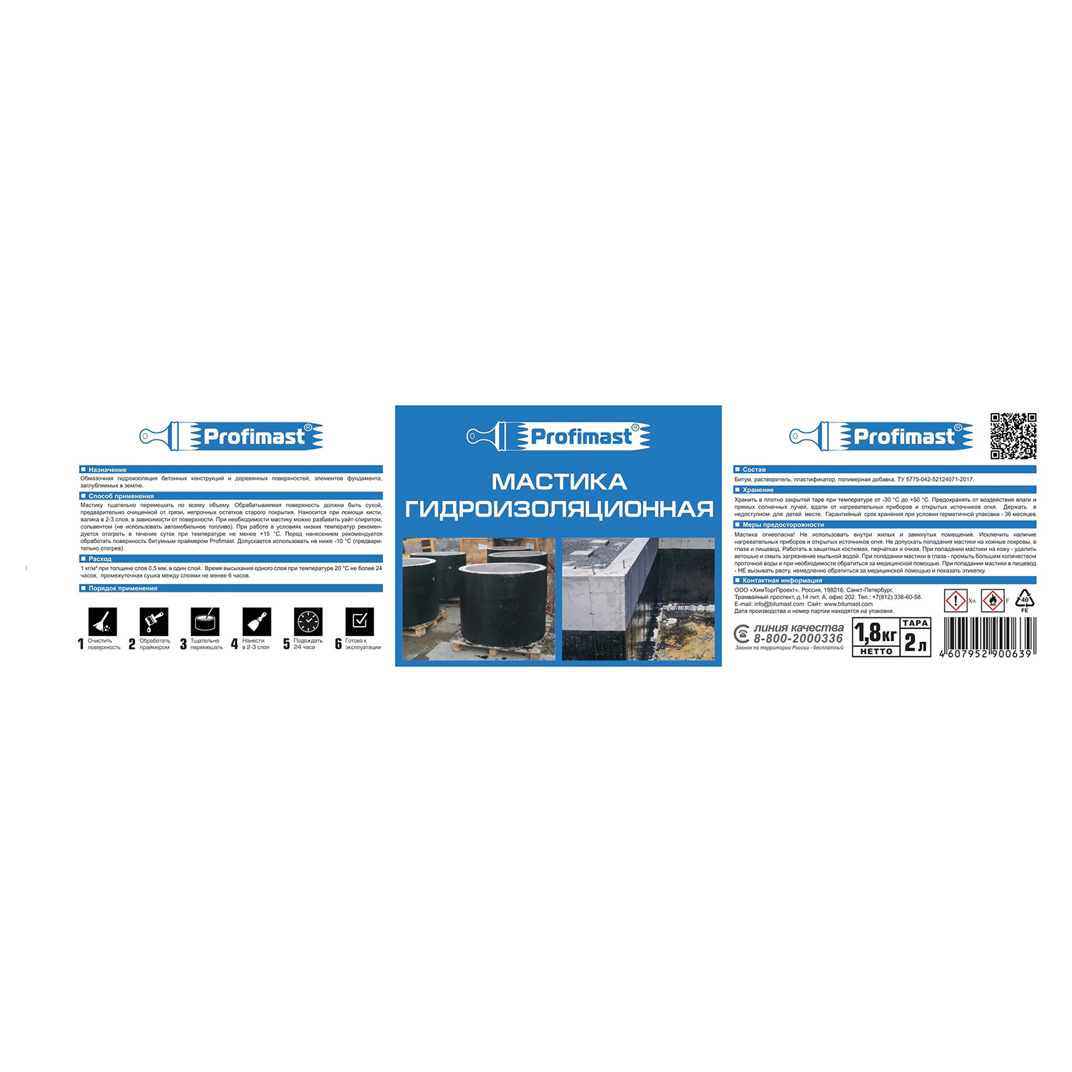 Мастика битумная гидроизоляционная Profimast 2 л представляет собой полностью готовый к применению продукт на основе нефтяного битума, содержащий технологические добавки и растворитель.