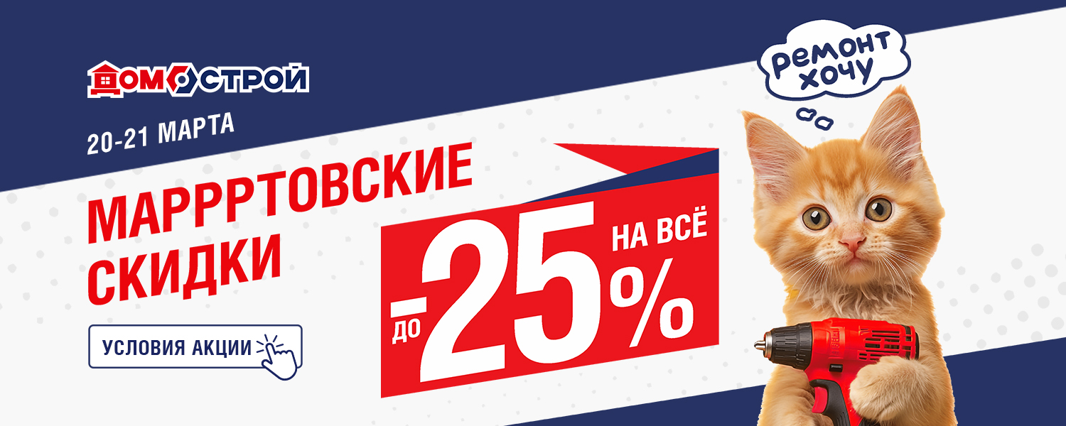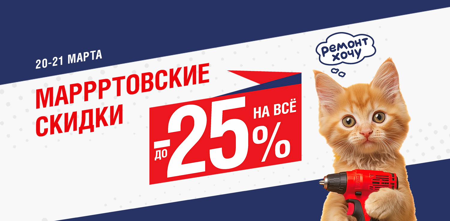 Распродажа МАРРРТОВСКИЕ СКИДКИ только 20 и 21 марта! Дарим скидку до -25% на все товары с белыми ценниками. Если у вас запланирован ремонт, строительство или обустройство дома - не упустите возможность купить все необходимое со скидкой: