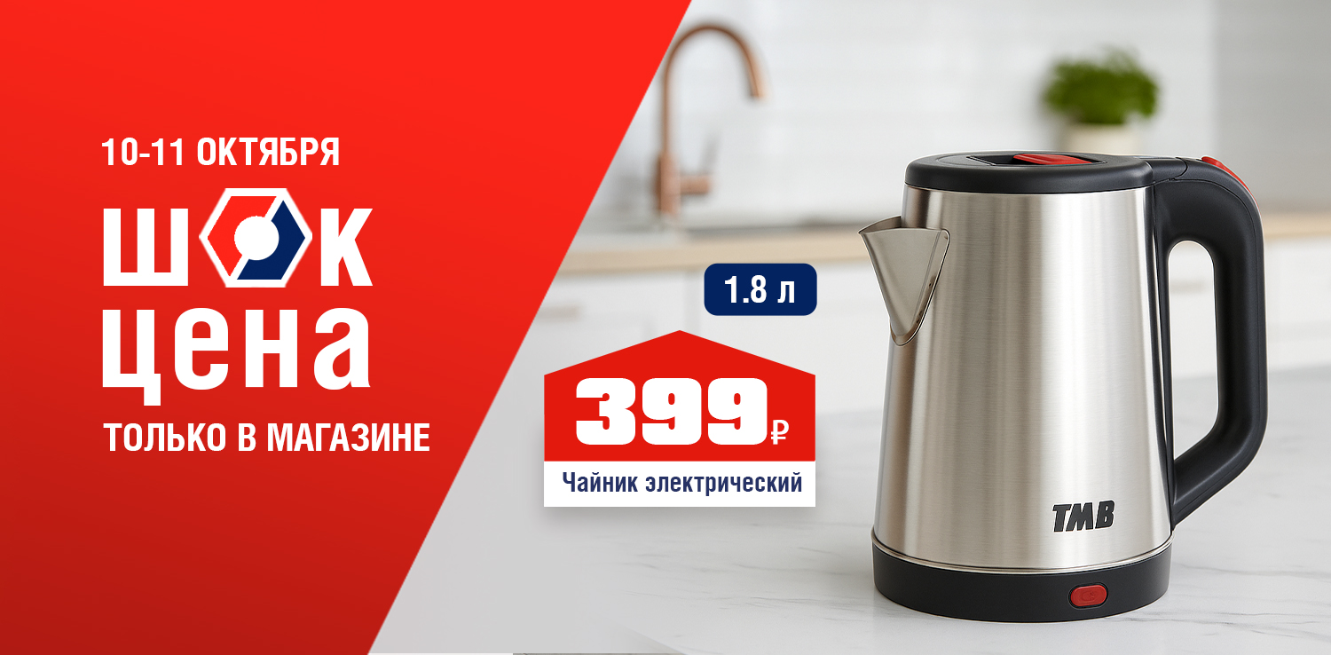 Цените каждую минуту? Этот чайник создан для вас! Мощность 1500 Вт и корпус из нержавеющей стали обеспечивают быстрое кипячение и долгий срок службы. Функция автоматического отключения гарантирует безопасность, а компактный объем идеально подходит для ежедневного использования. 10 и 11 октябрся в розничных магазинах ДомоСтрой не пропустите ШОК-цену: