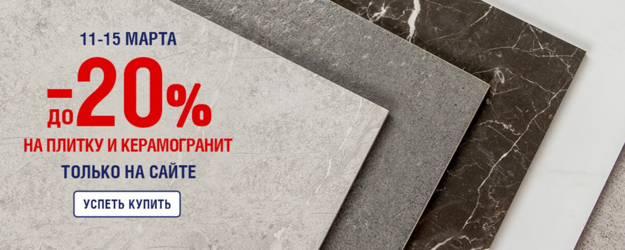 Онлайн-распродажа в сети ДомоСтрой! С 11 по 15 марта — скидка до 20% на плитку и керамогранит. Не упустите шанс обновить интерьер по выгодной цене! Стильная плитка в ванной, эффектный керамогранит на полу или яркий фартук на кухне — сделайте свой дом еще уютнее.